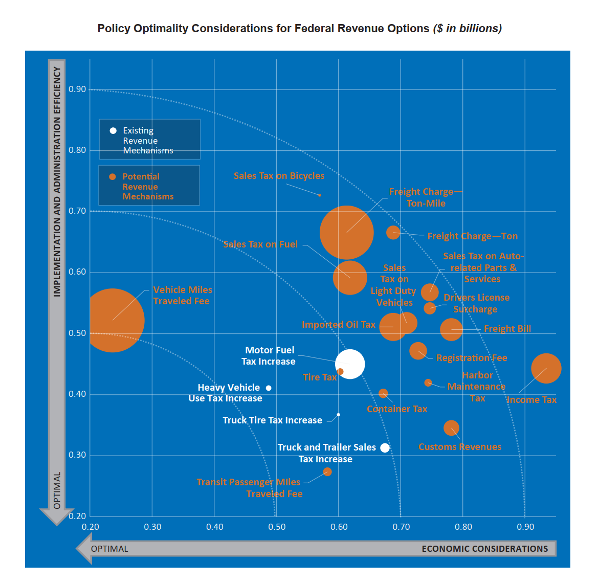 In 2019, we created a comprehensive matrix of potential federal revenue sources for funding transportation. The report included descriptions of the mechanisms, estimated yields, and an analysis of the policy optimality of potential mechanisms based on evaluation criteria developed for the National Surface Transportation Infrastructure Financing Commission. The analysis was shared widely with federal and state policymakers.